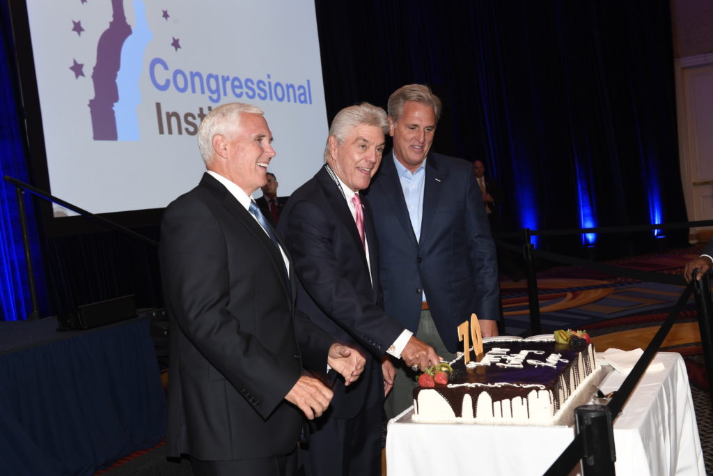 Vice President Mike Pence and Republican Leader Kevin McCarthy help celebrate Rep. Roger Williams’ birthday at the 2019 U.S. House Republican Member Conference.